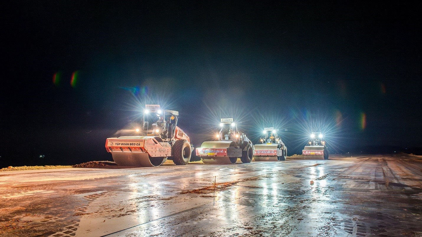 Nhằm bù đắp tiến độ bị ảnh hưởng do mùa mưa kéo dài, nhà thầu đã đồng loạt triển khai nhiều mũi thi công như thi công nền, cấp phối đá dăm, bê tông nhựa... đồng thời tổ chức thi công "gối đầu" cả ngày lẫn đêm để đảm bảo tiến độ tổng thể. Đặc biệt, các đơn vị đã chủ động tập kết sẵn nguồn đá tại hiện trường, đảm bảo nguồn vật liệu được cung ứng liên tục, không gián đoạn.