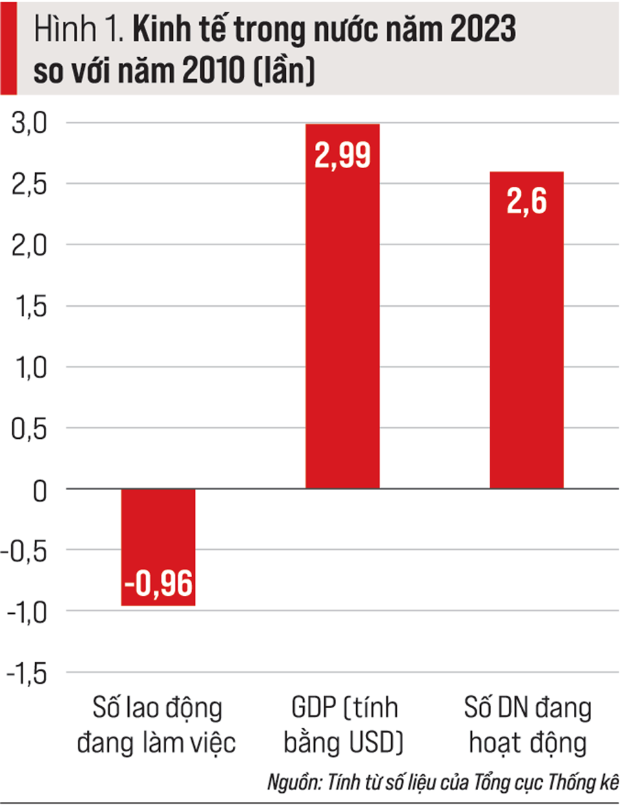 Thứ nhất, nội lực (kinh tế trong nước), năm 2023 so với năm 2010 về chỉ tiêu (hình 1). Đó là kết quả của công cuộc đổi mới ở trong nước, có tác động khai thác nguồn lực của các thành phần kinh tế, tinh thần khởi nghiệp của doanh nhân.