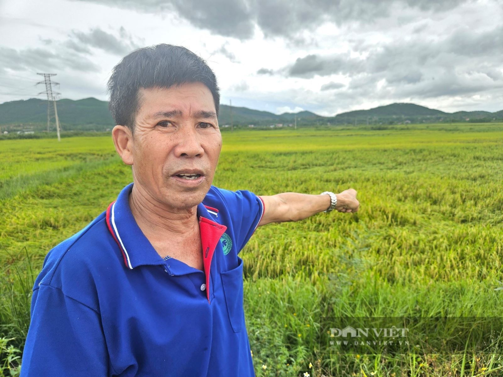 Nông dân Lưu Thanh Hải ở xã Bắc Trạch, tỉnh Quảng Trị đứng bên ruộng lúa bị ngã đổ sau bão số 5. Ảnh: Trần Anh