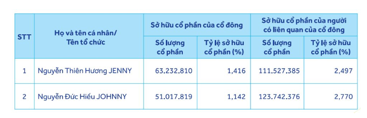 Theo danh sách cổ đông sở hữu trên 1% vốn điều lệ mà ACB công bố ngày 29/4/2025, 2 người con của bà Thúy là bà Nguyễn Thiên Hương JENNY và ông Nguyễn Đức Hiếu JONNY lần lượt nắm hơn 63,2 triệu cổ phiếu và 51 triệu cổ phiếu ACB.