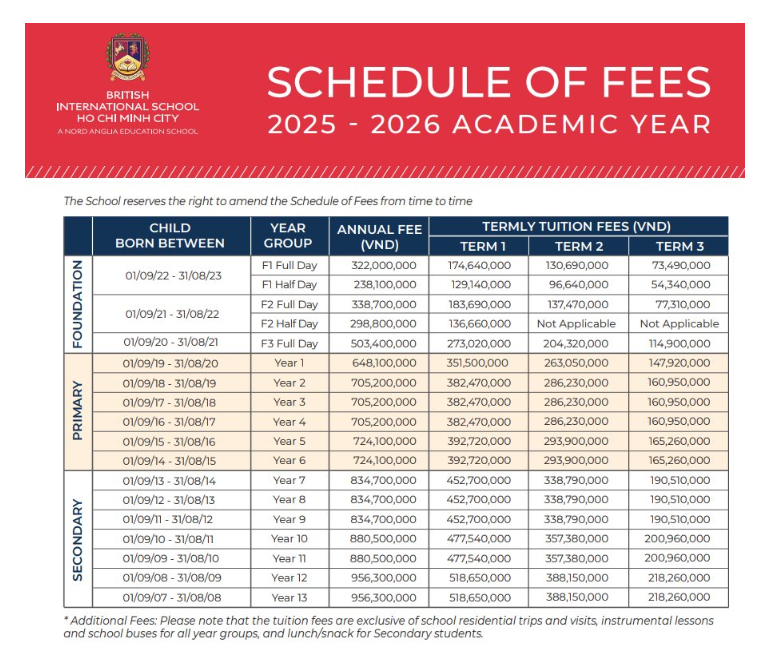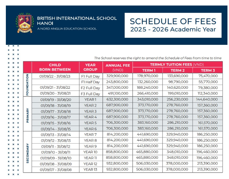 Là một thành viên thuộc hệ thống giáo dục Nord Anglia, học phí trường quốc tế Anh – BIS tại Hà Nội và TP.HCM ở mức cao. Tại Hà Nội (năm học 2023-2024), mức phí dao động từ 243,8 triệu đồng (mẫu giáo nửa ngày) đến 932,8 triệu đồng/năm (THPT). Tại TP. HCM (2024-2025), con số cao hơn: từ 238,1 triệu đến 910,7 triệu đồng/năm, chưa kể phí bổ sung như xe đưa đón, bữa ăn hay chuyến dã ngoại.