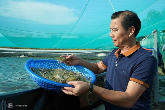 Ông Nghĩa kiểm tra con tôm thẻ. Ảnh: Chúc Ly