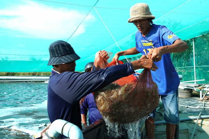 Thu hoạch tôm thẻ nuôi trong hồ tròn nổi. Ảnh: Chúc Ly