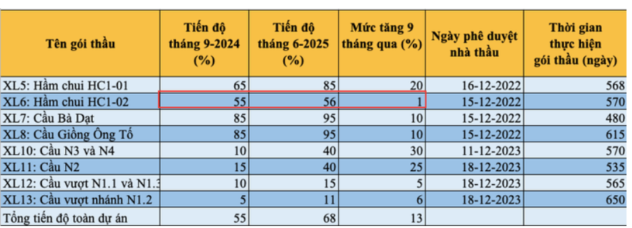 Đặc biệt gói XL6 hầm chui HC1-02 dù nằm trong số các gói thầu khởi công sớm nhất nhưng tiến độ được chủ đầu tư nêu đến nay mới đạt 56%. Như vậy, nếu đối chiếu với báo cáo từ văn bản 6268 của chủ đầu tư vào tháng 9-2024, gói thầu này có tiến độ tăng chỉ đúng 1% trong suốt 9 tháng qua!?