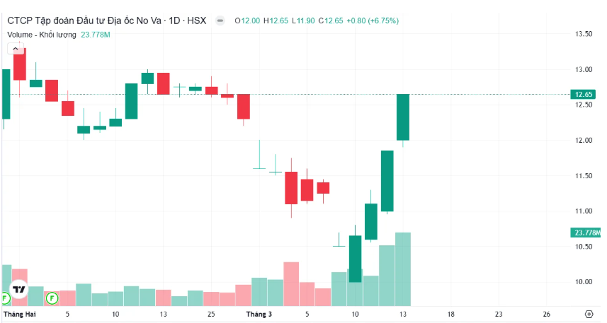 Sau nhiều tháng liên tiếp suy giảm và mất gần một nửa giá trị so với vùng đỉnh gần 20.000 đồng/cổ phiếu vào tháng 8/2025, mã này đã bất ngờ đảo chiều. Kết thúc phiên ngày 13/3, NVL tăng kịch biên độ lên 12.650 đồng/cổ phiếu, tương đương mức tăng hơn 26% chỉ sau bốn phiên giao dịch.