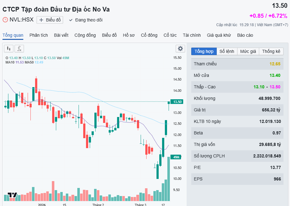 Theo đó, cổ phiếu NVL tiếp tục bứt tốc trong phiên đầu tuần, ghi nhận phiên tăng trần thứ ba liên tiếp, đưa thị giá lên 13.500 đồng/cp. Đây cũng là mức cao nhất của cổ phiếu trong hơn hai tháng qua.