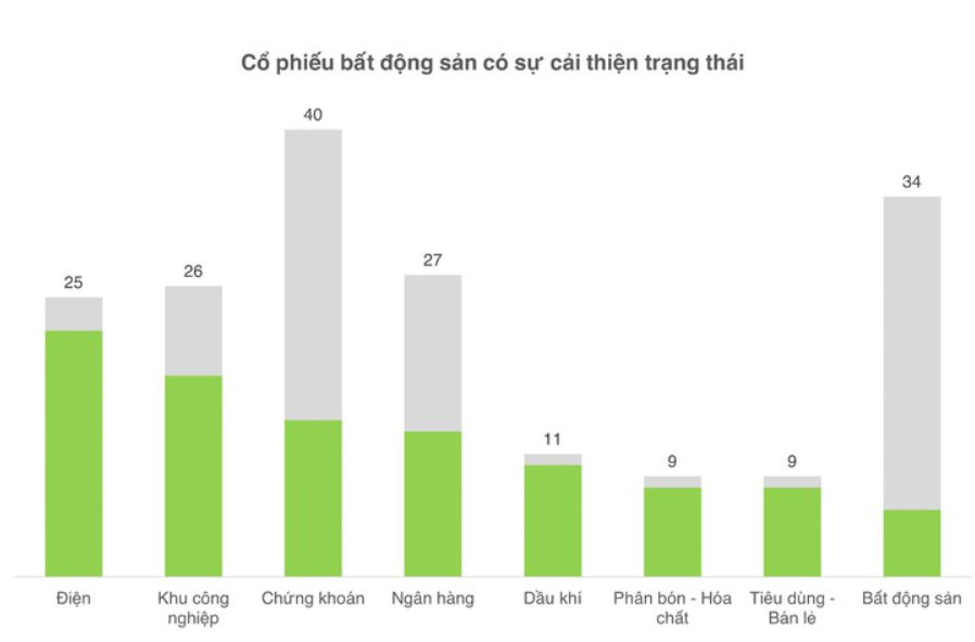 Tuy nhiên tín hiệu hồi phục bước đầu đã xuất hiện, khi tỉ lệ cổ phiếu bất động sản có mức tăng vượt VN-Index đã cải thiện, hiện chiếm khoảng 18% số mã trong ngành.