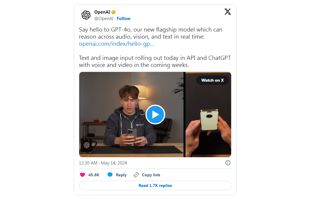 OpenAI giới thiệu “Bản cập nhật mùa xuân” cho ChatGPT, gọi là GPT-4o trên X/Twitter.