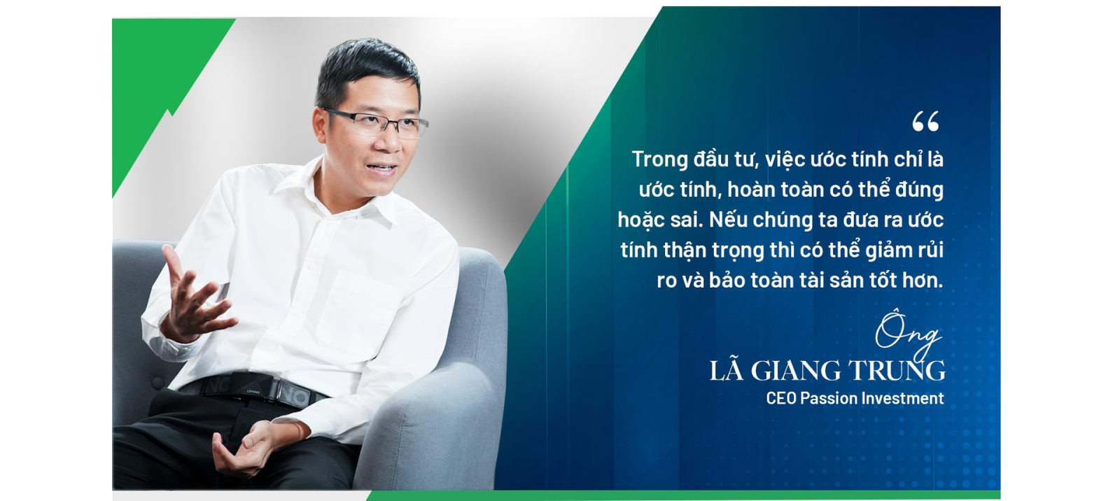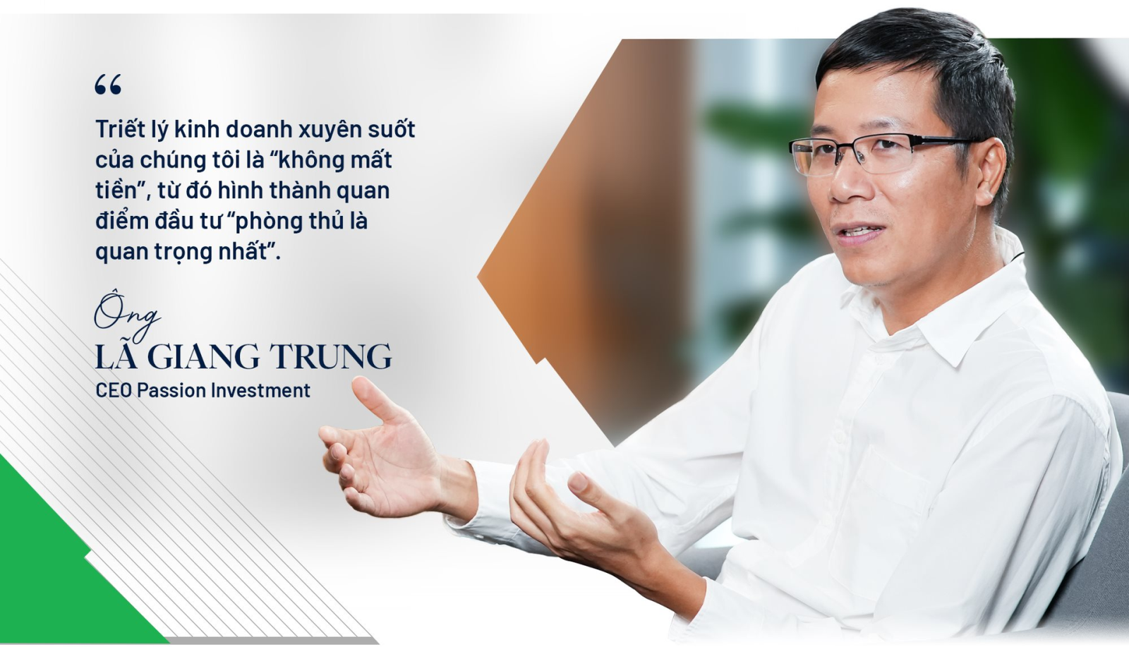 Ông Lã Giang Trung: Triết lý kinh doanh xuyên suốt của Passion Investment là không mất tiền từ đó hình thành quan điểm đầu tư “phòng thủ là quan trọng nhất”. Bởi thị trường chứng khoán Việt Nam biến động rất lớn, nếu tránh được những cú sập thì những việc tiếp theo rất đơn giản. Chúng tôi luôn cố gắng mua ở giá thấp và bảo toàn vốn khi khó khăn. Để làm được điều đó có rất nhiều cách và một trong những cách mà Passion Investment áp dụng là phương pháp đầu tư giá trị.
