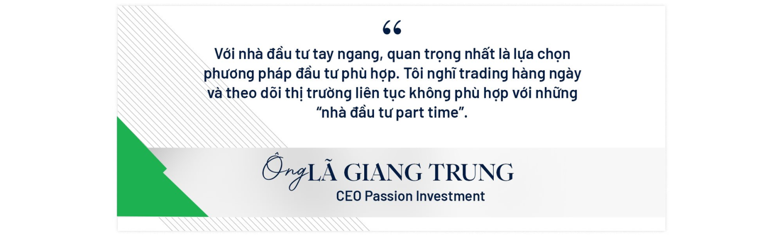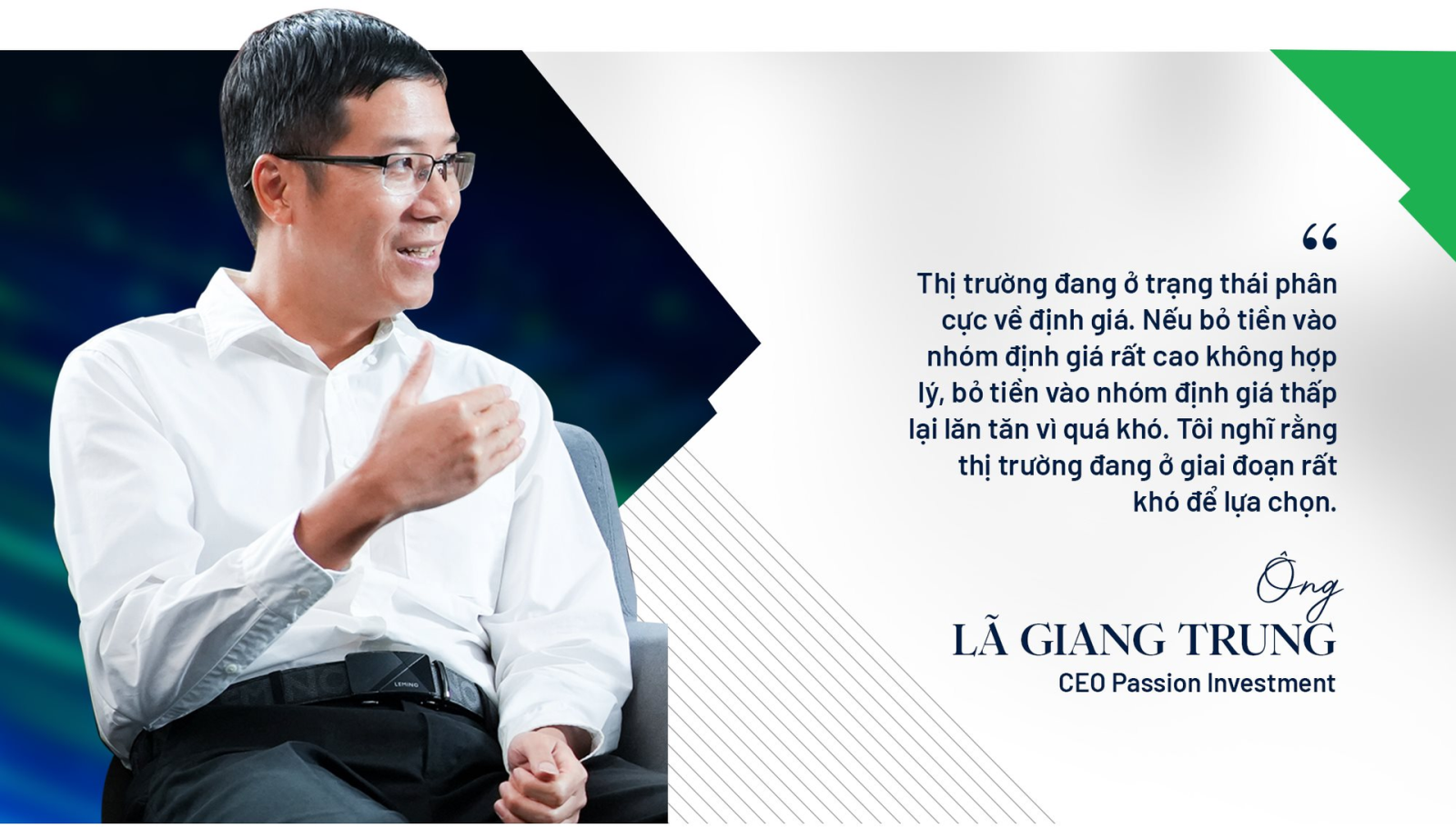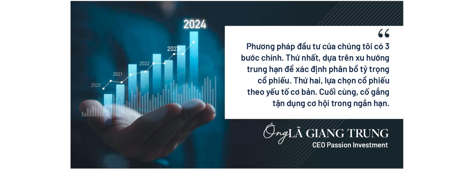 Trên thị trường chứng khoán Việt Nam những năm qua, Passion Investment dưới sự chèo lái của “thuyền trưởng” Lã Giang Trung đã trở thành cái tên khá quen thuộc với những dự báo có độ chính xác cao cùng tỷ suất sinh lợi danh mục vượt trội thị trường, lên tới hàng chục phần trăm mỗi năm.