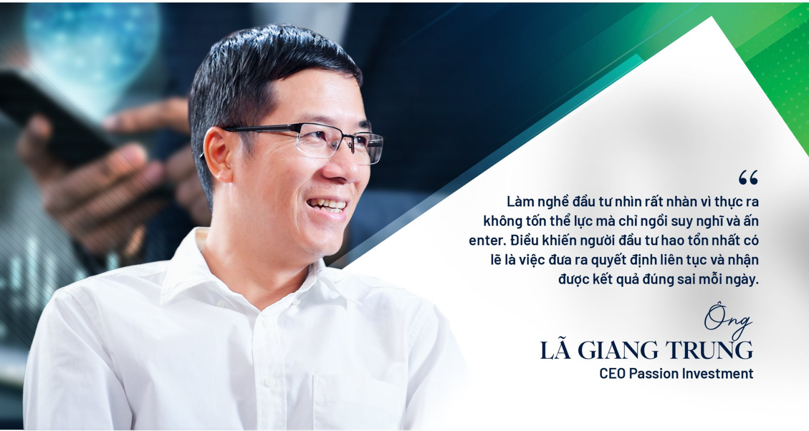 Ông Lã Giang Trung: Làm nghề đầu tư nhìn rất nhàn vì thực ra không làm gì hao tốn thể lực mà chỉ ngồi suy nghĩ và ấn enter thôi. Điều khiến người đầu tư hao tổn nhất có lẽ là việc đưa ra quyết định liên tục và nhận được kết quả đúng sai mỗi ngày. Nếu sai tâm trạng sẽ rất tệ, ngược lại đúng sẽ vui. Vì làm nghề có “biến động nhịp tim cao” nên nhiều bạn bè của tôi già đi trông thấy.