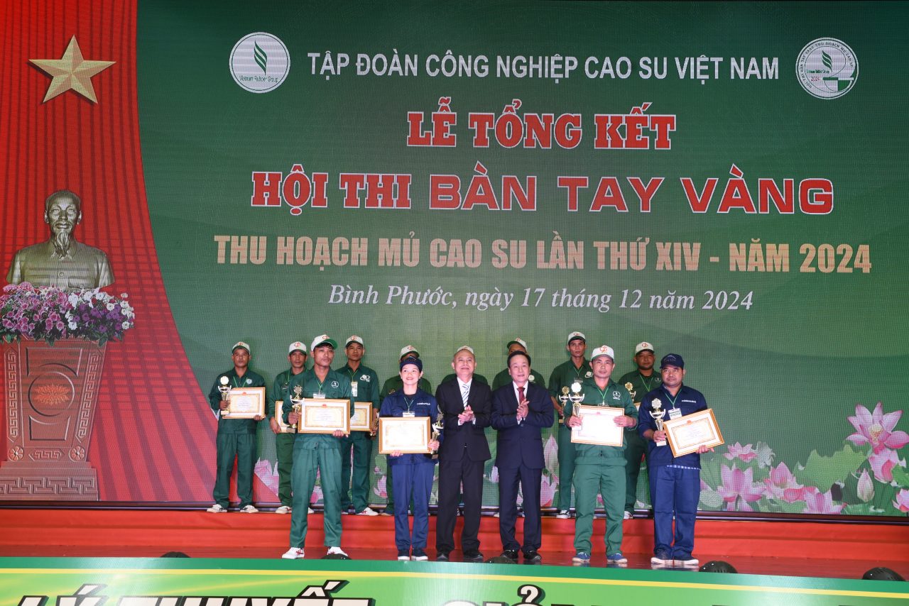 Ông Phạm Hải Dương – Phó TGĐ VRG (thứ 3 từ trái sang) và ông Trần Thanh Phụng – Phó TGĐ VRG trao thưởng tại Lễ tổng kết Hội thi Bàn tay vàng thu hoạch mủ cao su lần thứ XIV năm 2024. Ảnh: Vũ Phong
