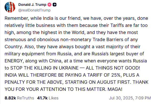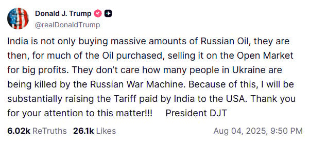 Trong một bài đăng trên mạng xã hội Truth Social, ông Trump viết: "Ấn Độ không chỉ mua nhiều dầu của Nga, mà sau đó, với phần lớn số dầu đã mua, họ còn bán ra thị trường mở để thu lời lớn" và rằng Ấn Độ không quan tâm đến số người chết ở Ukraine do xung đột với Nga.