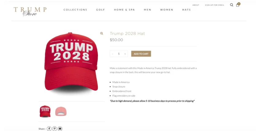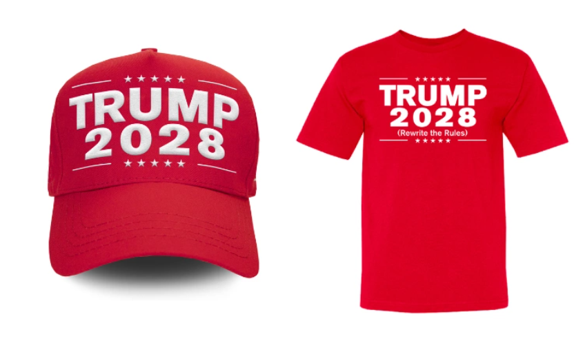 Cửa hàng trực tuyến của ông Trump vừa tung ra bộ sưu tập mũ và áo thun in dòng chữ "Trump 2028", ám chỉ cuộc bầu cử tổng thống tiếp theo tại Mỹ – dù theo Hiến pháp, ông không còn đủ điều kiện tái tranh cử.