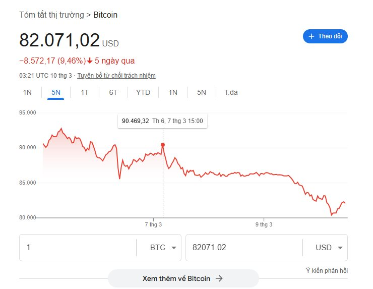 Sáng 10/3 theo giờ Hà Nội, Bitcoin rơi xuống còn 81.712 USD, giảm hơn 5% so với phiên trước đó. Kể từ thời điểm ông Trump ký lệnh thành lập Quỹ Dự trữ Bitcoin hôm 7/3, đồng tiền số này liên tục giảm mạnh thay vì tăng như nhiều người kỳ vọng.