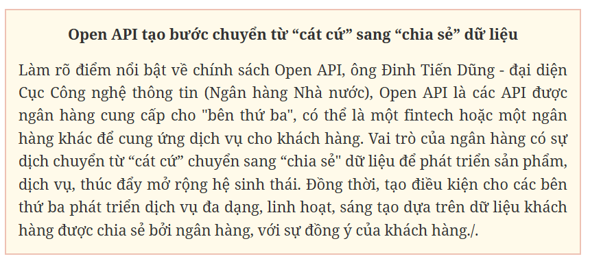 Việt Nam đang bước vào giai đoạn phát triển mạnh của fintech và ngân hàng mở, khi Open API trở thành nền tảng thúc đẩy đổi mới, mở rộng hệ sinh thái số và tài chính toàn diện. Các chuyên gia quốc tế đánh giá cao nỗ lực số hóa của Việt Nam, đặc biệt việc ban hành Thông tư 64/2024/TT-NHNN, tạo bước chuyển quan trọng thúc đẩy ngân hàng mở, chuẩn hóa và tăng cường chia sẻ dữ liệu tài chính an toàn.