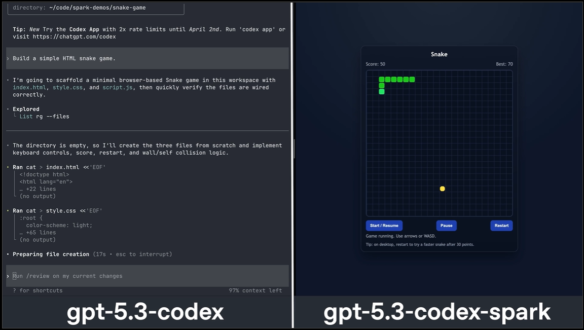 Codex-Spark được tối ưu hóa cho các công việc tương tác, nơi độ trễ quan trọng ngang với mức độ thông minh. Cùng một nhiệm vụ nhưng thời gian Codex-Spark xử lý nhanh hơn rất nhiều.