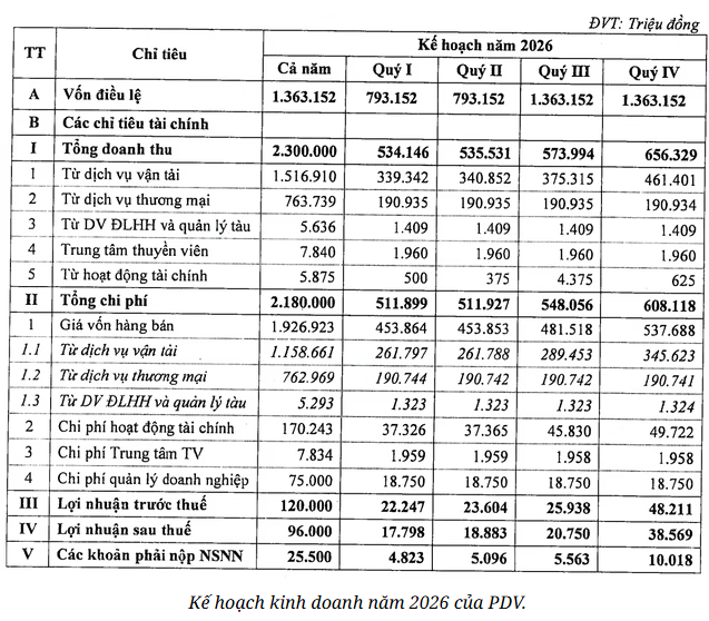 Theo đó, trong năm 2026, PVT Logistics đặt mục tiêu tổng doanh thu 2.300 tỷ đồng, trong đó, khoảng 66% doanh thu đến từ dịch vụ vận tải và phần còn lại chủ yếu đến từ hoạt động thương mại.