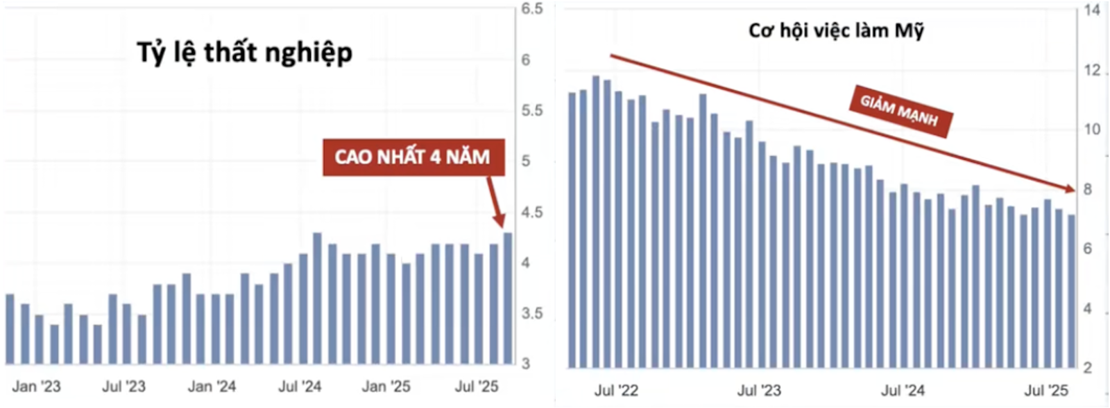 Thất nghiệp lên tới 4,3% – cao nhất trong 4 năm, số đơn đặt hàng mới giảm, doanh nghiệp thận trọng, không còn mở rộng tuyển dụng. Đây là tín hiệu hoàn toàn trái ngược với hy vọng nền kinh tế sẽ phục hồi sau thuế quan trước đó.