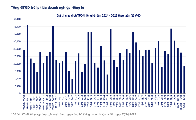 Thị trường trái phiếu doanh nghiệp tiếp tục duy trì đà sôi động trong tuần giữa tháng 10, với 19 đợt phát hành mới đạt tổng giá trị hơn 25.000 tỷ đồng. Hoạt động mua lại trước hạn cũng tăng tốc, doanh nghiệp đang chủ động cơ cấu nợ và tận dụng mặt bằng lãi suất ổn định.