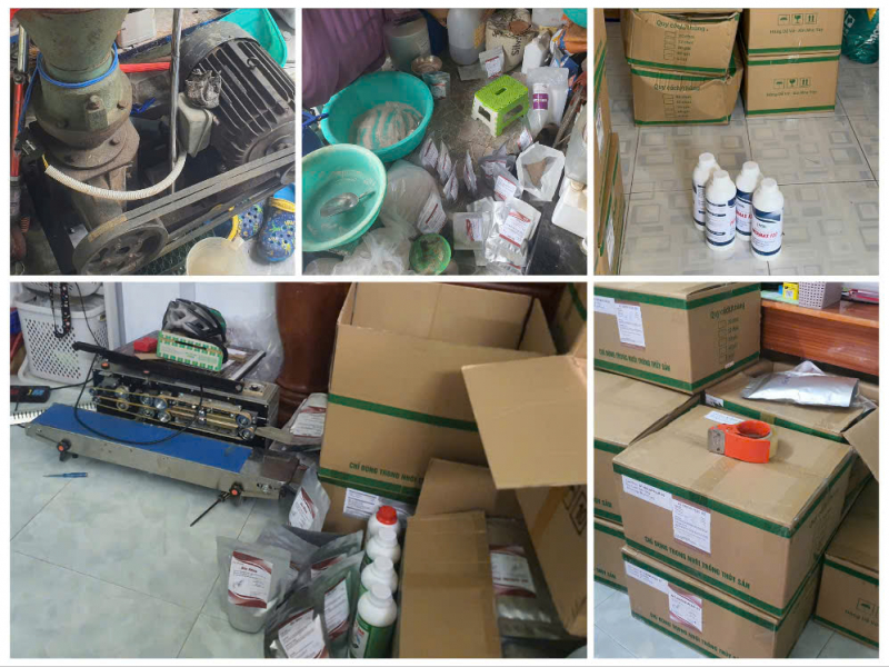 Kiểm tra tại phòng trọ số 9 nhà trọ Việt Linh (trên đường Lý Văn Phức, khóm Bình Khánh 5, phường Bình Khánh, TP Long Xuyên, An Giang) nơi Mão thuê để chứa các sản phẩm thuốc, thức ăn bổ sung của Công ty TNHH Nutrition Goodlife Việt Nam, cơ quan chức năng thu giữ nhiều sản phẩm và nguyên liệu dùng để sản xuất thuốc, thức ăn bổ sung, sản phẩm xử lý, cải tạo môi trường trong nuôi trồng thuỷ sản.