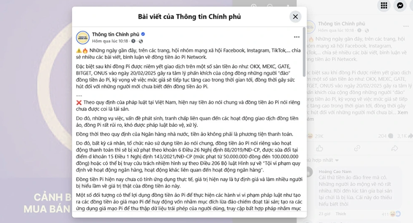 Sau khi đồng Pi được niêm yết trên một số sàn giao dịch tiền ảo vào ngày 20/2/2025, nhiều người đã bày tỏ sự phấn khích và kỳ vọng vào sự gia tăng giá trị của đồng tiền này. Tuy nhiên, cần lưu ý rằng theo quy định của pháp luật Việt Nam, tiền ảo (bao gồm cả đồng Pi) chưa được công nhận là tài sản hợp pháp. Điều này có nghĩa là các giao dịch liên quan đến đồng tiền ảo này có thể gặp rủi ro lớn và không được pháp luật bảo vệ.