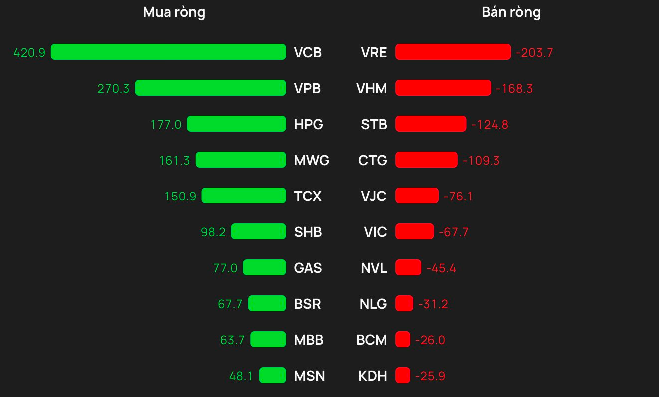 Tại chiều mua, cổ phiếu VCB được khối ngoại mua mạnh nhất trên HOSE với giá trị hơn 421 tỷ đồng. Theo sau, VPB là mã tiếp theo được gom mạnh 270 tỷ đồng. Ngoài ra, HPG và MWG cũng được mua lần lượt 177 và 161 tỷ đồng.
