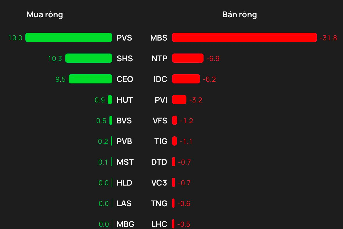 Chiều ngược lại, MBS là mã chịu áp lực bán ròng của khối ngoại với giá trị gần 32 tỷ đồng; theo sau NTP bị bán 7 tỷ, IDC, PVI, VFS bị bán từ vài tỷ đồng.