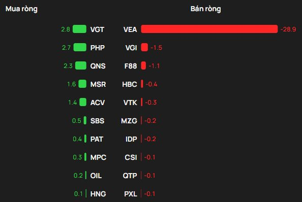 Ngược chiều, VEA bị khối ngoại bán ròng 29 tỷ đồng. Ngoài ra khối ngoại cũng bán ròng tại VGI, F88,...