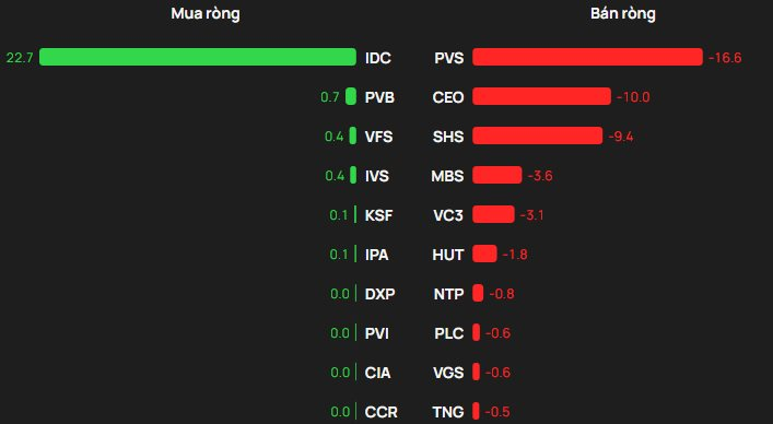 Lực mua ròng nổi bật nhất thuộc về IDC (khoảng 23 tỷ đồng), các vị trí tiếp theo lần lượt là PVB (0,7 tỷ), VFS (0,4 tỷ), IVS (0,4 tỷ) và KSF (0,1 tỷ).