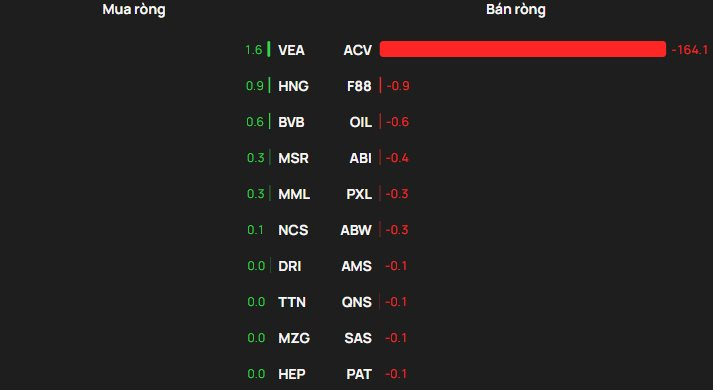 Ở chiều bán ròng, tâm điểm thuộc về ACV (xấp xỉ 164 tỷ đồng), còn lại đều rất nhỏ gồm F88 (0,9 tỷ), OIL (0,6 tỷ), ABI (0,4 tỷ) và PXL (0,3 tỷ).