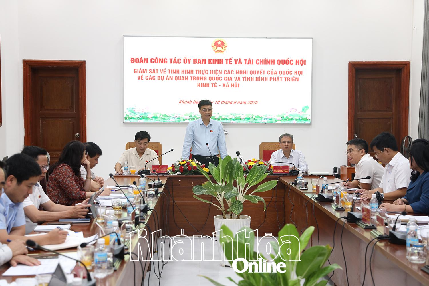 Chiều 18-8, Đoàn công tác Ủy ban Kinh tế và Tài chính Quốc hội làm việc với UBND tỉnh giám sát tình hình thực hiện các nghị quyết của Quốc hội về các dự án trọng điểm quốc gia và tình hình phát triển kinh tế - xã hội trên địa bàn tỉnh. Các đồng chí: Vũ Hồng Thanh - Ủy viên Trung ương Đảng, Phó Chủ tịch Quốc hội; Nguyễn Minh Sơn - Phó Chủ nhiệm Ủy ban Kinh tế và Tài chính Quốc hội chủ trì buổi làm việc. Đồng chí Trần Hòa Nam - Phó Chủ tịch UBND tỉnh làm việc với đoàn công tác.