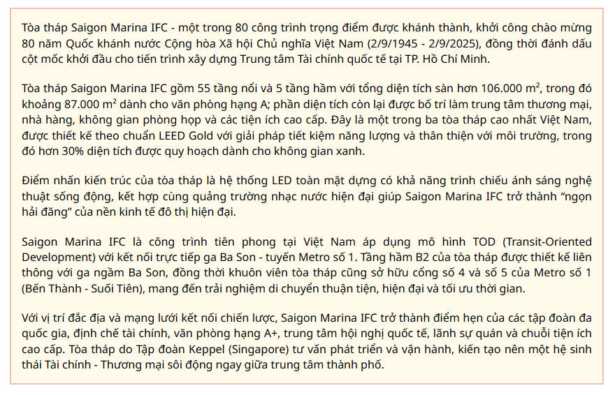 Theo Nghị quyết 222/2025/QH15 của Quốc hội, việc hình thành Trung tâm Tài chính quốc tế tại TP. Hồ Chí Minh là định hướng chiến lược dài hạn, nhằm đưa thành phố trở thành điểm đến của dòng vốn và hoạt động tài chính khu vực. Saigon Marina IFC chính là công trình đầu tiên mở đầu cho hành trình này, cung cấp hạ tầng tiêu chuẩn cho các tổ chức tài chính, doanh nghiệp và nhà đầu tư toàn cầu.