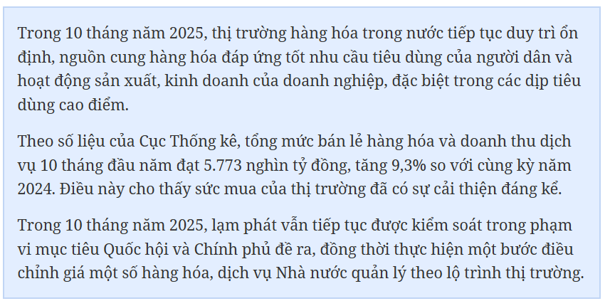 Đồng thời tiếp tục đảm bảo cân đối cung - cầu, đặc biệt là các nhóm hàng hóa: Lương thực, thực phẩm, xăng dầu, nguyên liệu đầu vào, bất động sản… bảo đảm nguồn cung hàng hóa cho các địa phương bị ảnh hưởng bởi lũ lụt; cũng như phục vụ cho dịp Tết Âm lịch sắp tới. Thực hiện đồng bộ các giải pháp để hỗ trợ các hộ nghèo và các gia đình khó khăn. Xuất cấp kịp thời hàng dự trữ quốc gia để thực hiện các chính sách an sinh xã hội và điều tiết thị trường khi cần thiết.