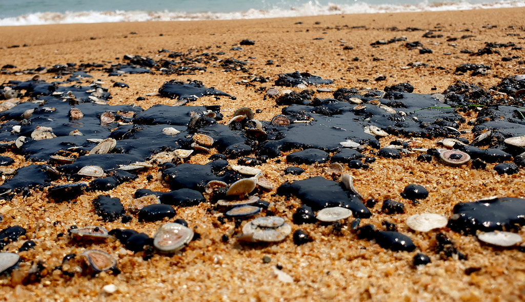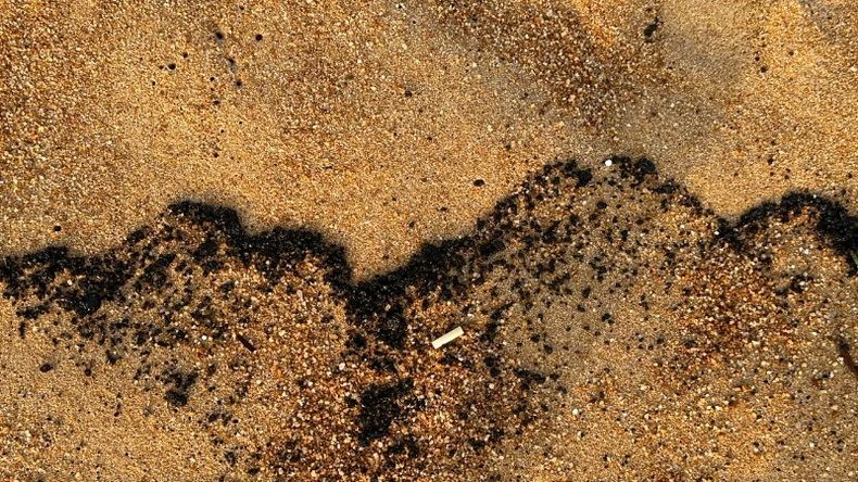 Theo Báo Nhân Dân, hiện tuy đã giảm nhiều nhưng dầu vón cục vẫn tiếp tục trôi dạt vào bờ biển - Ảnh: NDO.