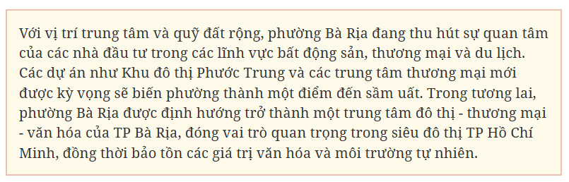 Theo các chuyên gia kinh tế, phường Bà Rịa sau sáp nhập, không thể bỏ qua các khía cạnh phát triển văn hóa, xã hội và triển vọng phát triển trong tương lai.