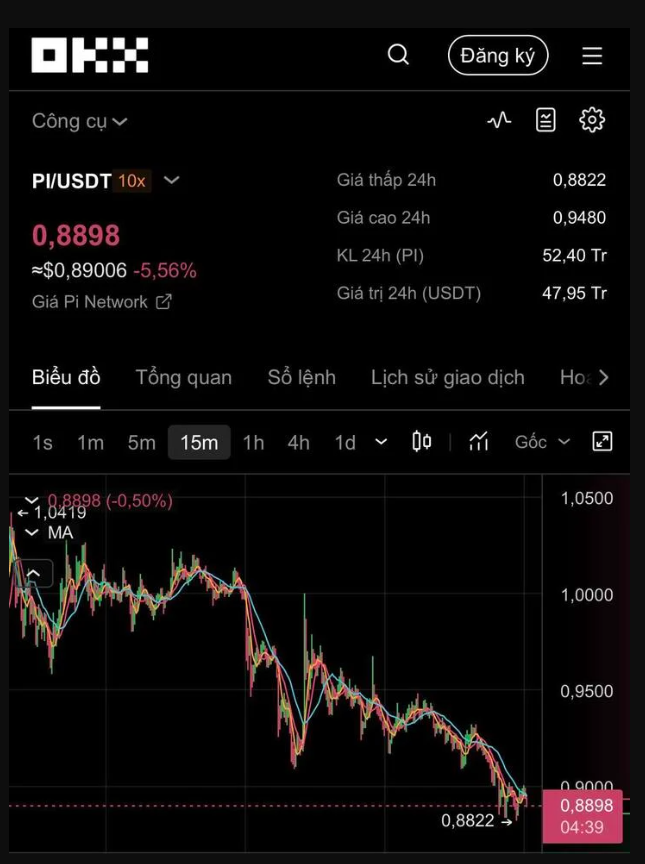 Tiền ảo Pi liên tục lao dốc. (Ảnh chụp màn hình)