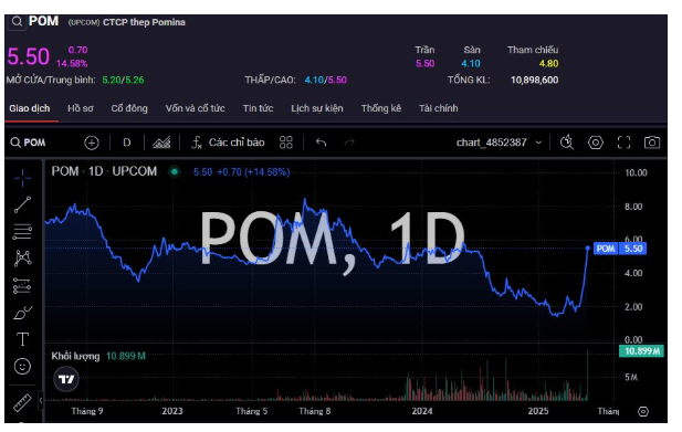 Thị giá POM leo lên mốc 5.500 đồng/cp, đánh dấu phiên trần phiên thứ 8 liên tiếp, qua đó lên sát đỉnh gần 2 năm. Đáng nói, cổ phiếu của Pomina hồi sinh giữa lúc đang trong diện hạn chế giao dịch và chỉ được giao dịch vào phiên thứ 6 hàng tuần.