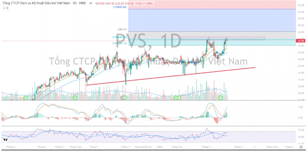 Giá cổ phiếu trong 2 phiên 13 và 14/05 đã có xu hướng suy yếu nhưng thanh khoản lại rất nhỏ. Theo đó, TPS kỳ vọng PVS có thể vượt vùng đỉnh cũ và hướng tới mức giá mục tiêu cao hơn là 52.000 đồng/cổ phiếu.