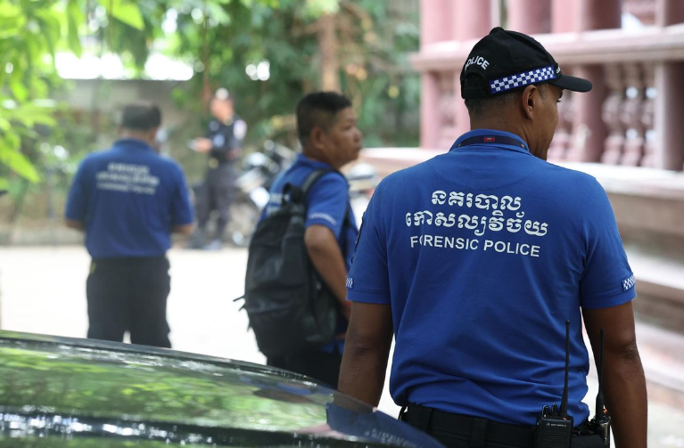 Cảnh sát Campuchia có mặt tại ngôi chùa ở Phnom Penh để thực hiện khám nghiệm tử thi sinh viên Hàn Quốc nghi bị tra tấn đến chết. Ảnh: Yonhap