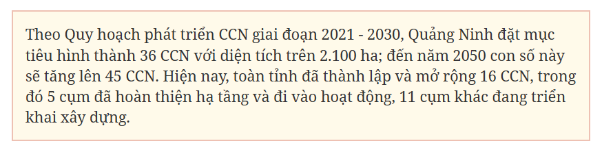 Thực tế cho thấy, hệ thống CCN không chỉ mở rộng không gian sản xuất tập trung mà còn giúp di dời các cơ sở sản xuất nhỏ lẻ ra khỏi khu dân cư, giảm thiểu ô nhiễm và xây dựng mô hình công nghiệp xanh, hiện đại. Giai đoạn 2021 - 2024, ngành công nghiệp chế biến, chế tạo của Quảng Ninh tăng trưởng bình quân trên 22%/năm, chiếm hơn 12% GRDP. Trong bức tranh tăng trưởng đó, đóng góp của các CCN là hết sức quan trọng.