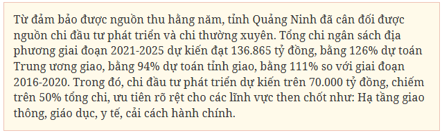 Trong giai đoạn 2021-2025, tổng thu NSNN của Quảng Ninh dự kiến đạt 274.000 tỷ đồng, cao hơn 30% so với giai đoạn 2016-2020. Trong đó, thu nội địa chiếm khoảng 71%, phản ánh xu hướng phát triển ổn định, giảm phụ thuộc vào khai thác tài nguyên. Đây là bước chuyển quan trọng, phù hợp với mục tiêu phát triển bền vững và bảo đảm an sinh xã hội.