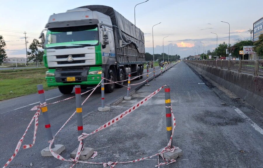 Ghi nhận tại hiện trường đoạn qua Khu công nghiệp VSIP, nhà thầu giăng dây phản quang chiếm một nửa làn đường, cắm biển báo và tiến hành bóc tách lớp nhựa cũ. Thế nhưng, theo phản ánh của người dân và ghi nhận của phóng viên, hơn một tuần qua, đơn vị thi công ngừng việc sửa chữa, không có bất kỳ công nhân hay máy móc nào tiếp tục sửa chữa.