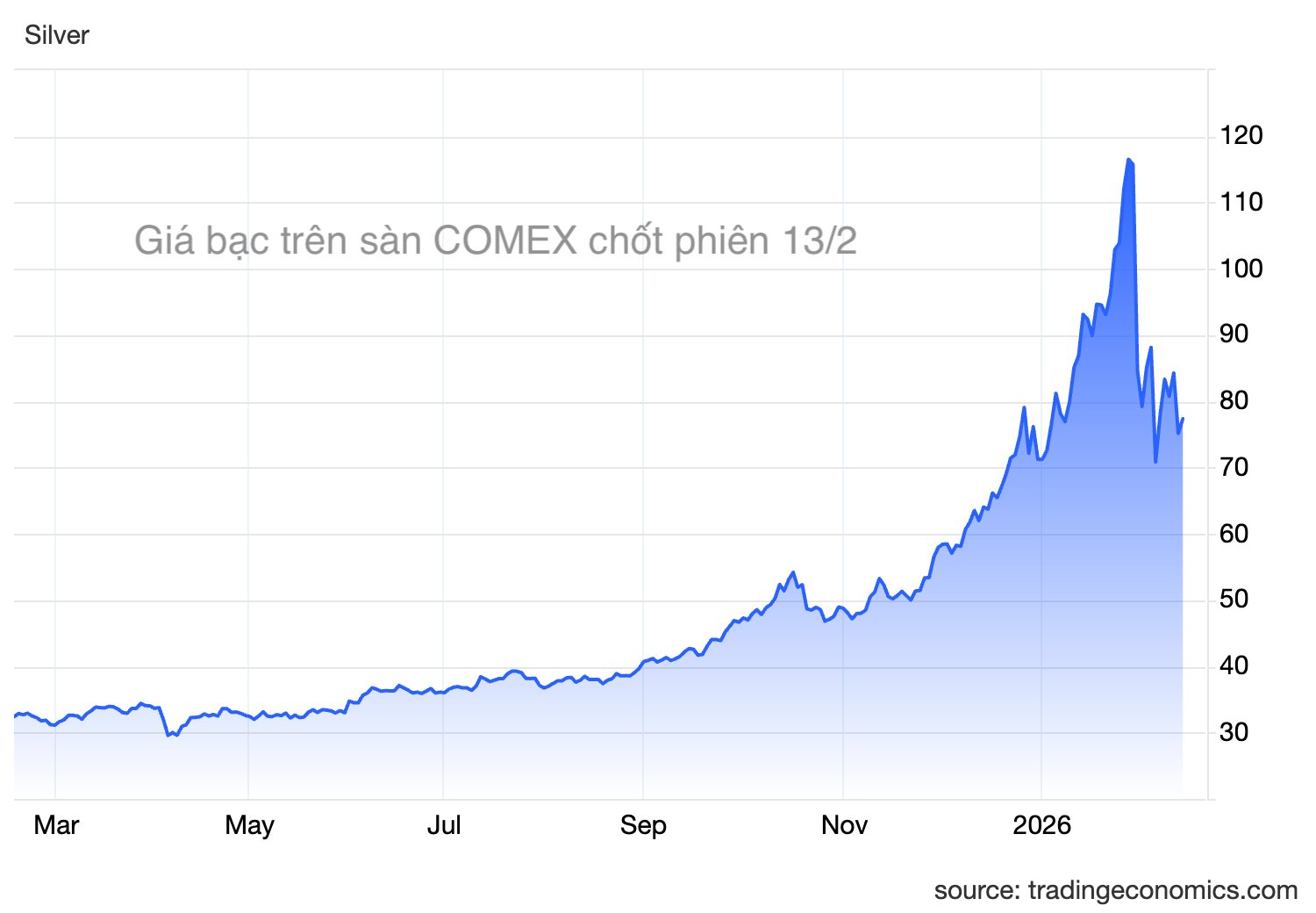 Đóng cửa phiên 13/2, giá bạc trên sàn COMEX (Mỹ) tăng 3% lên mốc 77,4 USD/ounce, phục hồi sau mức giảm 11% trong phiên trước đó. Trước đó, giá bạc đang trên đà giảm 0,3% trong tuần.