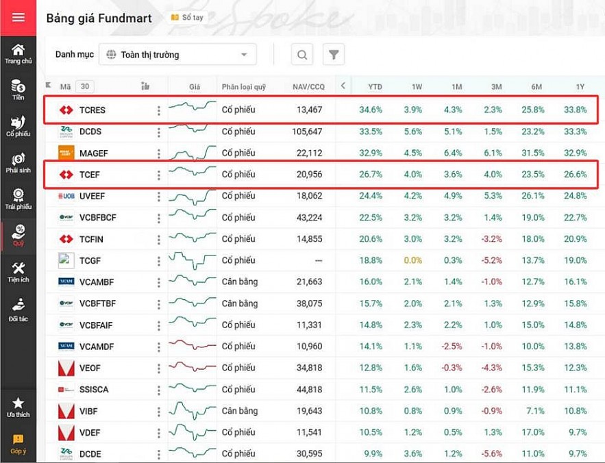 Theo dữ liệu từ nền tảng giao dịch quỹ thông minh Fundmart, quỹ cổ phiếu TCRES và TCEF đang dẫn dắt cuộc đua lợi nhuận từ đầu năm 2025 (YTD) với mức tăng trưởng lần lượt là 34,6% và 26,7%. Sự bứt phá này không phải là ngẫu nhiên, mà là kết quả của việc định vị danh mục chuẩn xác dựa trên các trụ cột tăng trưởng của nền kinh tế trong chu kỳ mới.