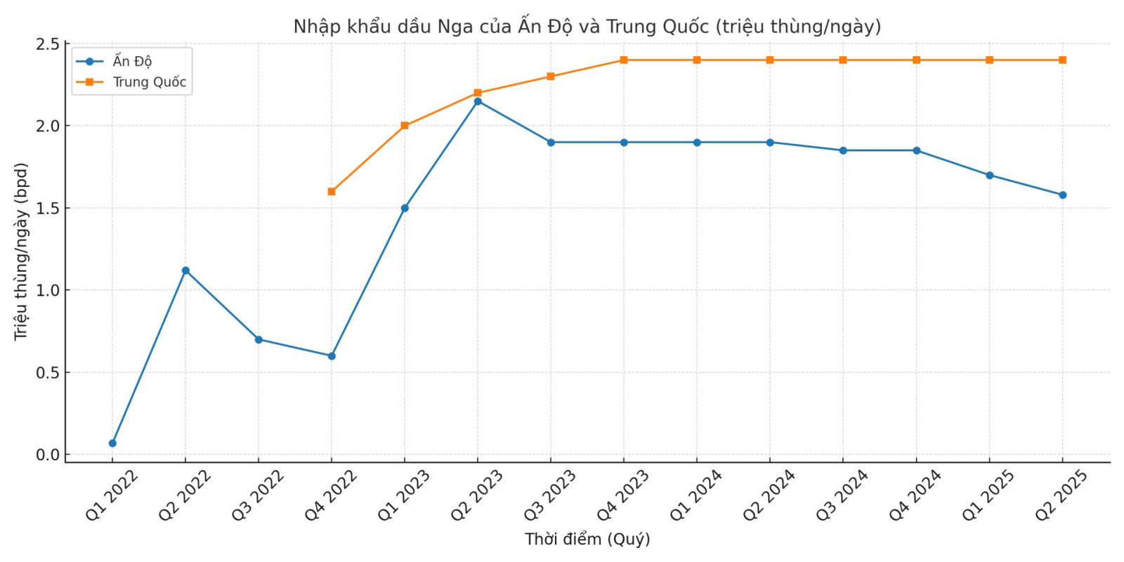 Kể từ khi phương Tây bắt đầu cắt nhập khẩu dầu Nga năm 2022, Ấn Độ nhanh chóng nắm bắt cơ hội. Quốc gia Nam Á này gần như không mua dầu từ Nga trước đó, nhưng nay nhập khẩu gần 2 triệu thùng/ngày. Sản phẩm chủ yếu là dầu nặng, chiếm 35-40% tổng lượng dầu thô nhập khẩu của Ấn Độ. Nhờ nguồn cung giá rẻ này, chi phí nhập khẩu giảm và các nhà máy lọc dầu trong nước hưởng lợi lớn khi tái xuất sản phẩm với giá thị trường.