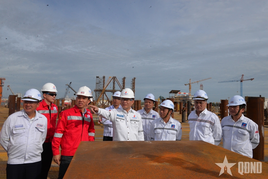 Lãnh đạo Petrovietnam kiểm tra trên công trường thi công lắp đặt giàn trung tâm của dự án.