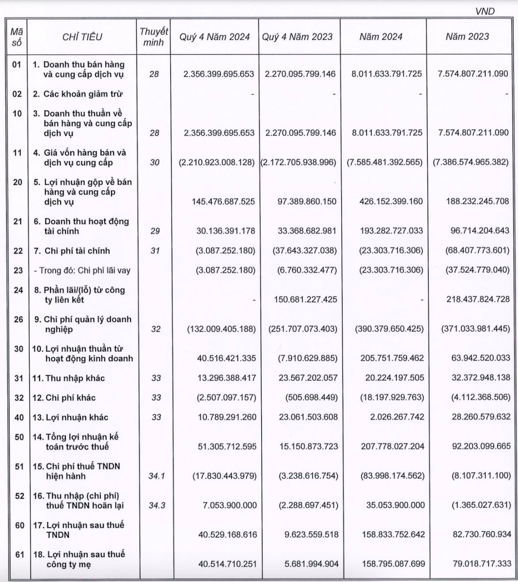 CTCP Tập đoàn Đầu tư Xây dựng Ricons (Ricons) vừa công bố BCTC hợp nhất quý 4/2024 với doanh thu thuần hơn 2.356 tỷ đồng, tăng 4% so với cùng kỳ. Trừ giá vốn, Công ty lãi gộp gần 146 tỷ đồng. Biên lãi gộp cải thiện từ 4% lên 6%.
