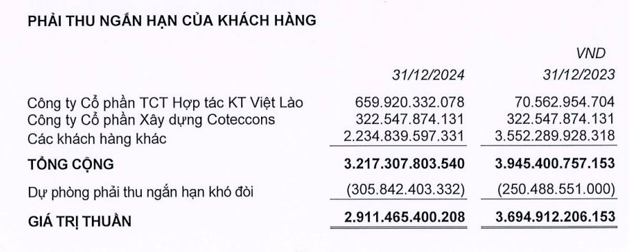 Đáng chú ý, theo thuyết minh của Ricons, Xây dựng Coteccons (mã chứng khoán CTD) vẫn đang nợ hơn 322 tỷ đồng và CTCP TCT Hợp tác KT Việt Lào gần 660 tỷ đồng. Trong đó, Ricons đang dự phòng gần 306 tỷ đồng nợ phải thu khó đòi.