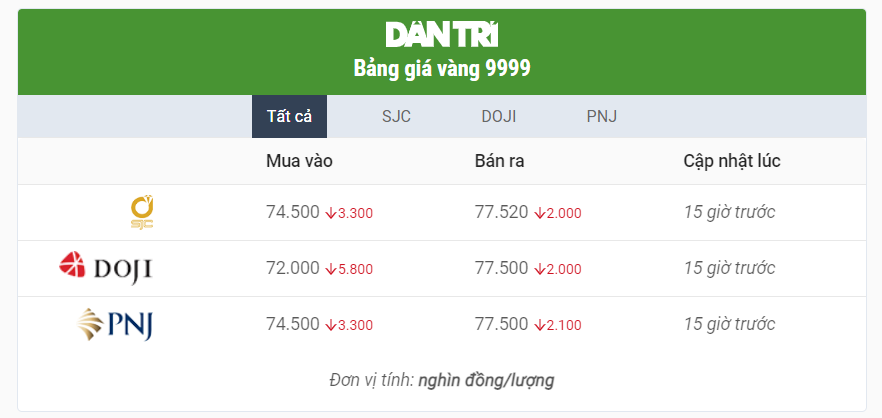 Sáng ngày 27/12, giá vàng thế giới là 2067 USD /ounce, và tỷ giá USD/VN tại VCB là 24,385. Dùng công thức quy đổi chúng ta có thể tính ra giá vàng Việt Nam là 61,420,000 VNĐ / lượng. Nhưng giá vàng miếng SJC đang được niêm yết quanh vùng 80 triệu đồng/lượng, cao hơn giá vàng quy đổi 31% (diễn biến thị trường vàng ngày 28/12 bạn có thể cập nhật trên báo Dân trí ).
